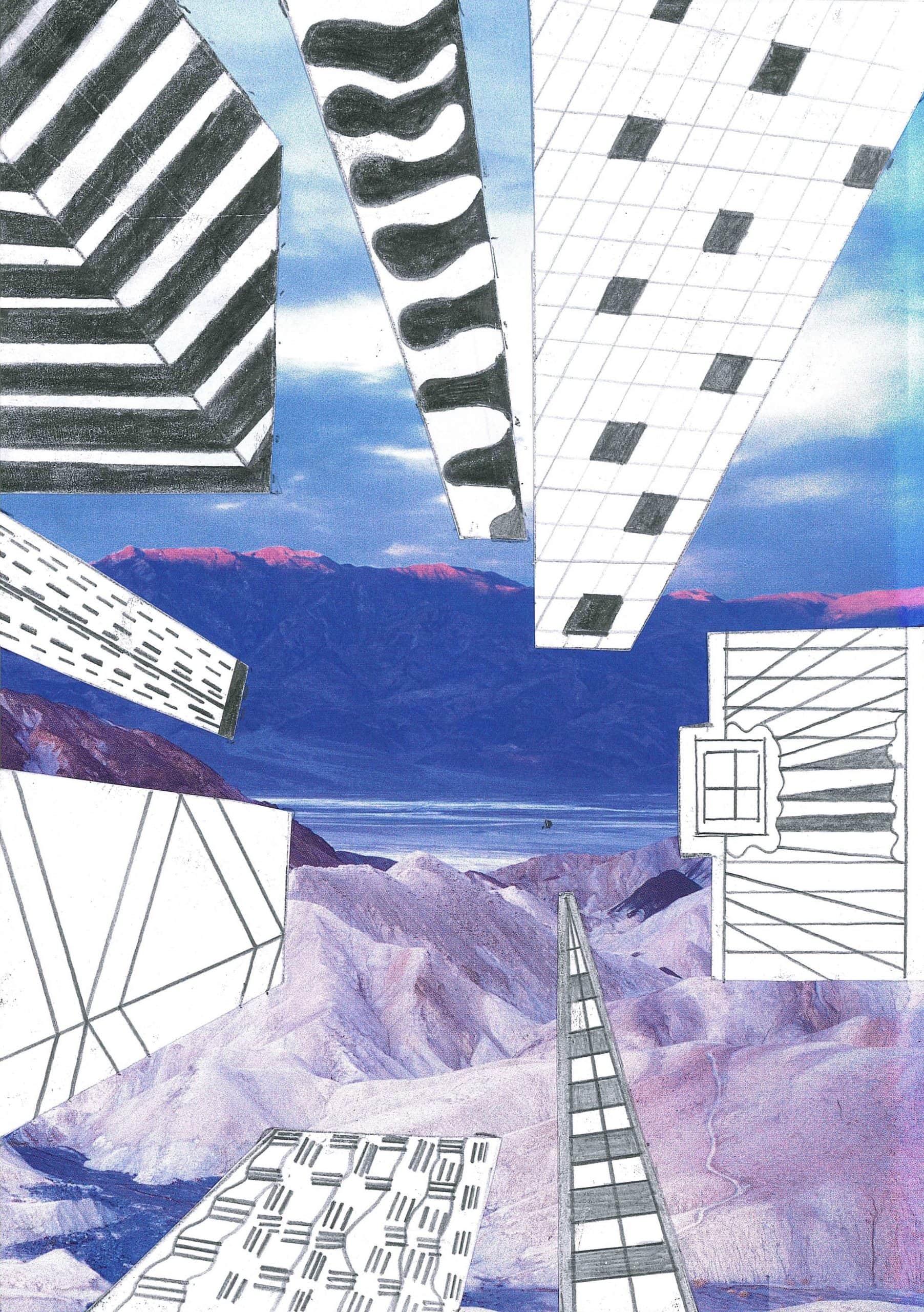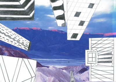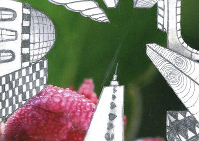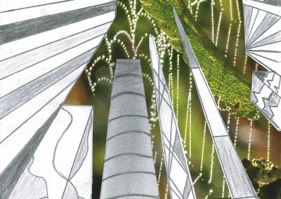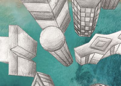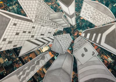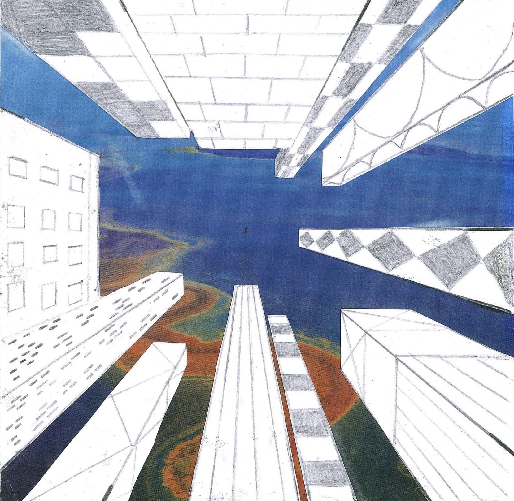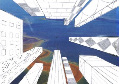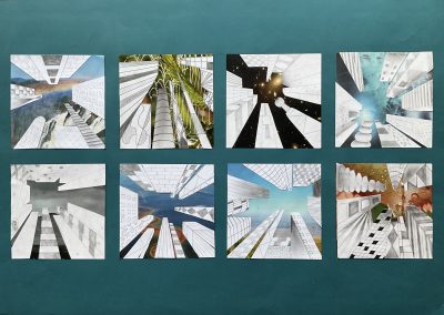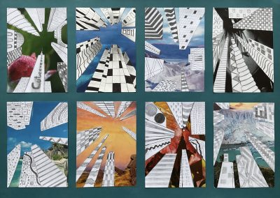 Um die Illusion eines dreidimensionalen Raumes weiter zu verstärken, fügte jeder Einzelne ein Foto als Hintergrund hinzu. Dazu wurden die Hochhäuser entweder ausgeschnitten und auf die farbigen Hintergrundmotive geklebt, oder am eigenen iPad mithilfe von Adobe Photoshop auf die Fotografien digital montiert.