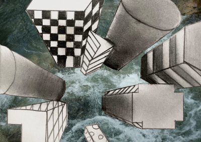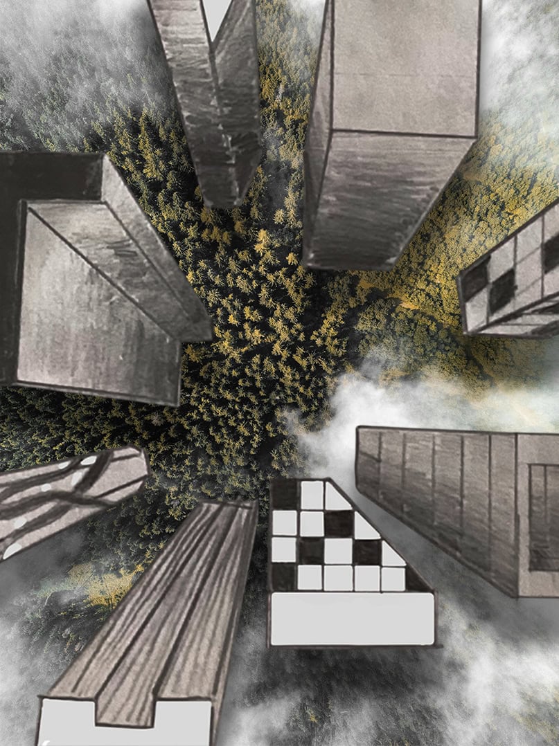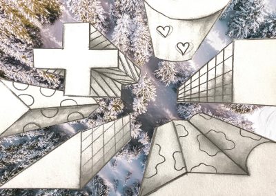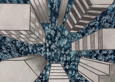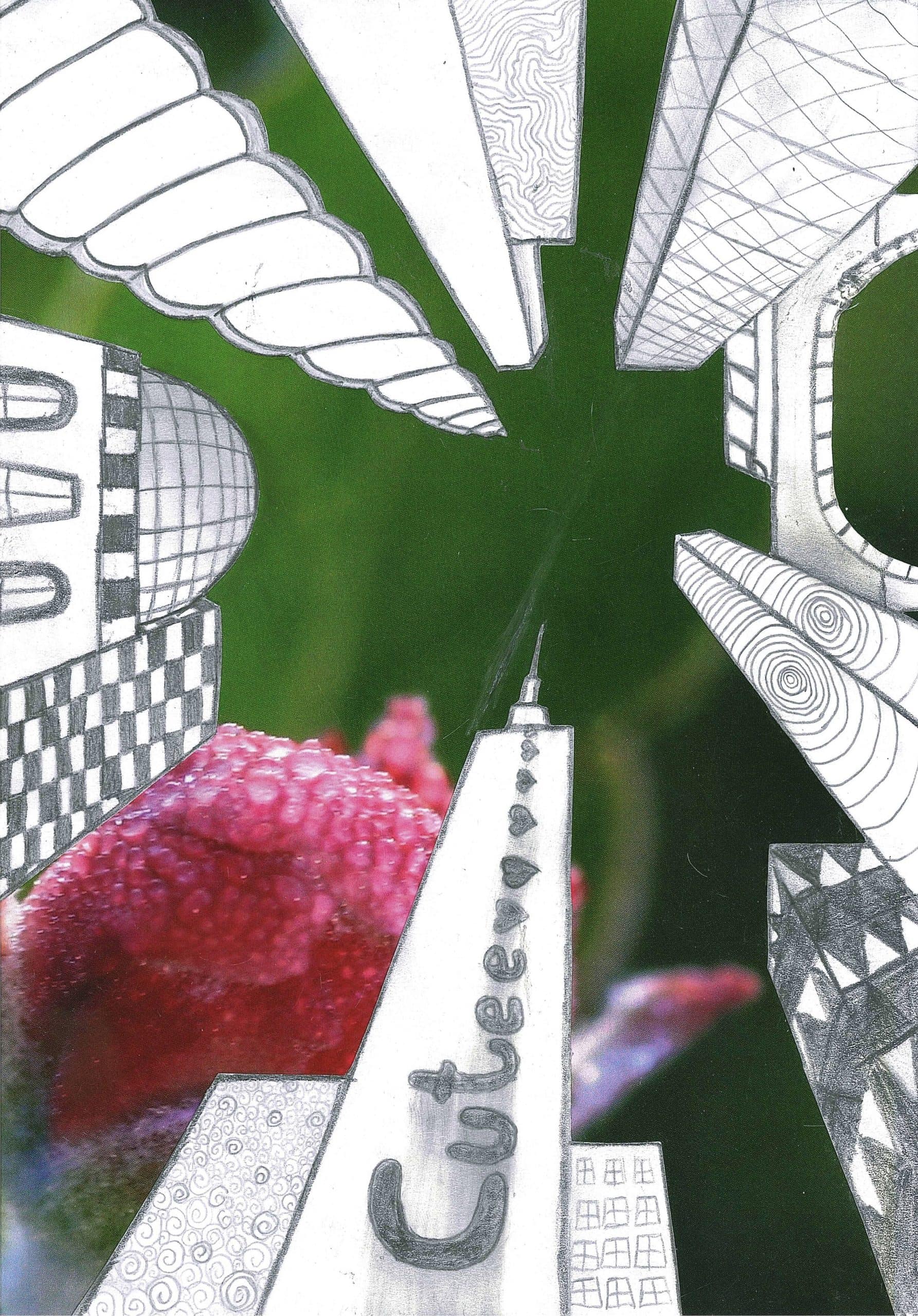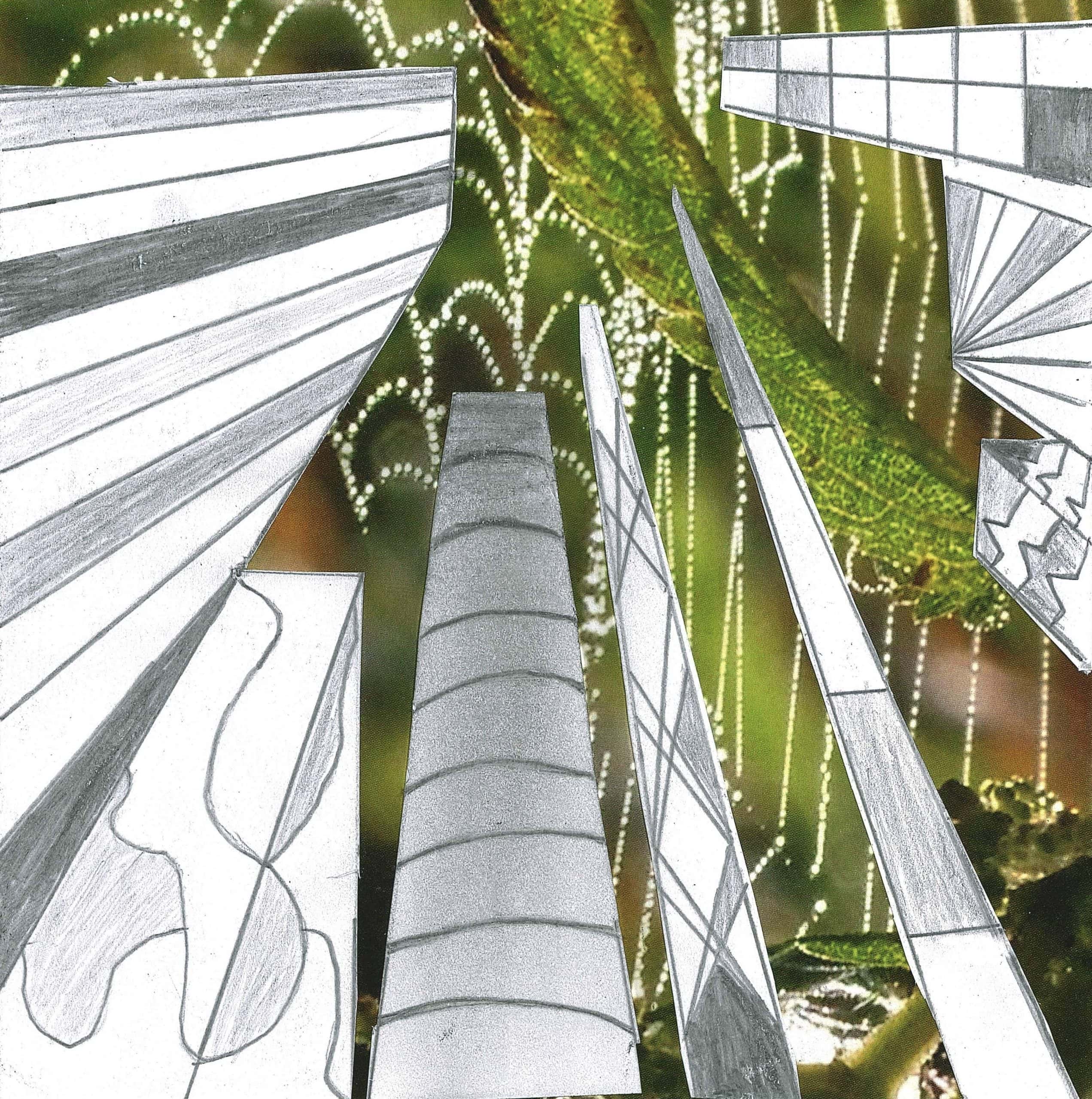 Um die Illusion eines dreidimensionalen Raumes weiter zu verstärken, fügte jeder Einzelne ein Foto als Hintergrund hinzu. Dazu wurden die Hochhäuser entweder ausgeschnitten und auf die farbigen Hintergrundmotive geklebt, oder am eigenen iPad mithilfe von Adobe Photoshop auf die Fotografien digital montiert.