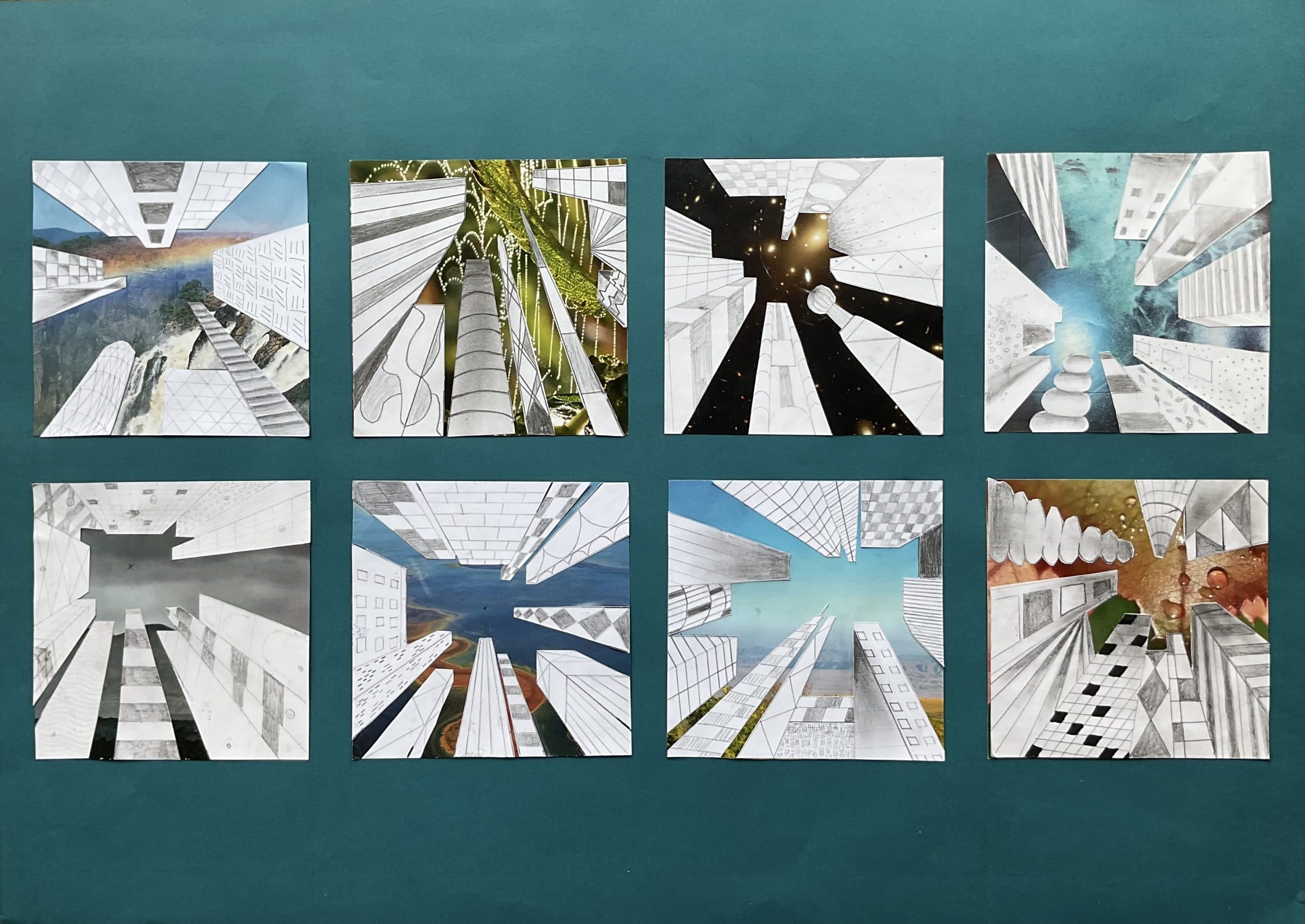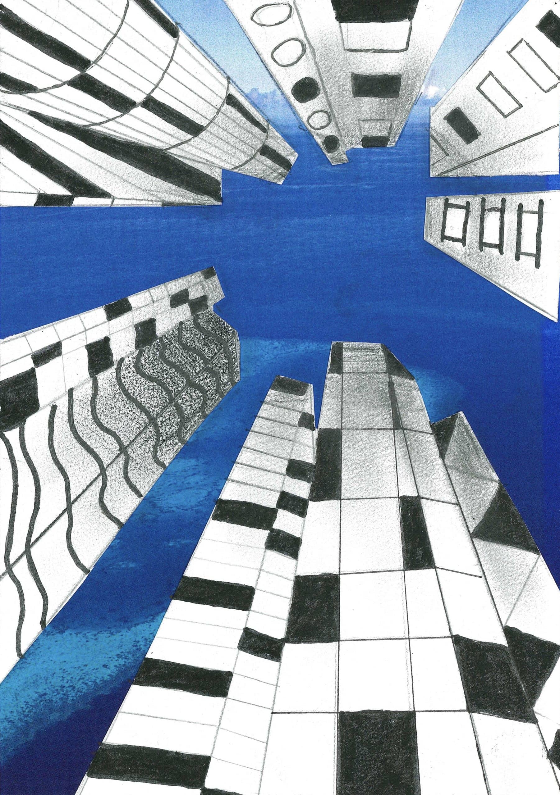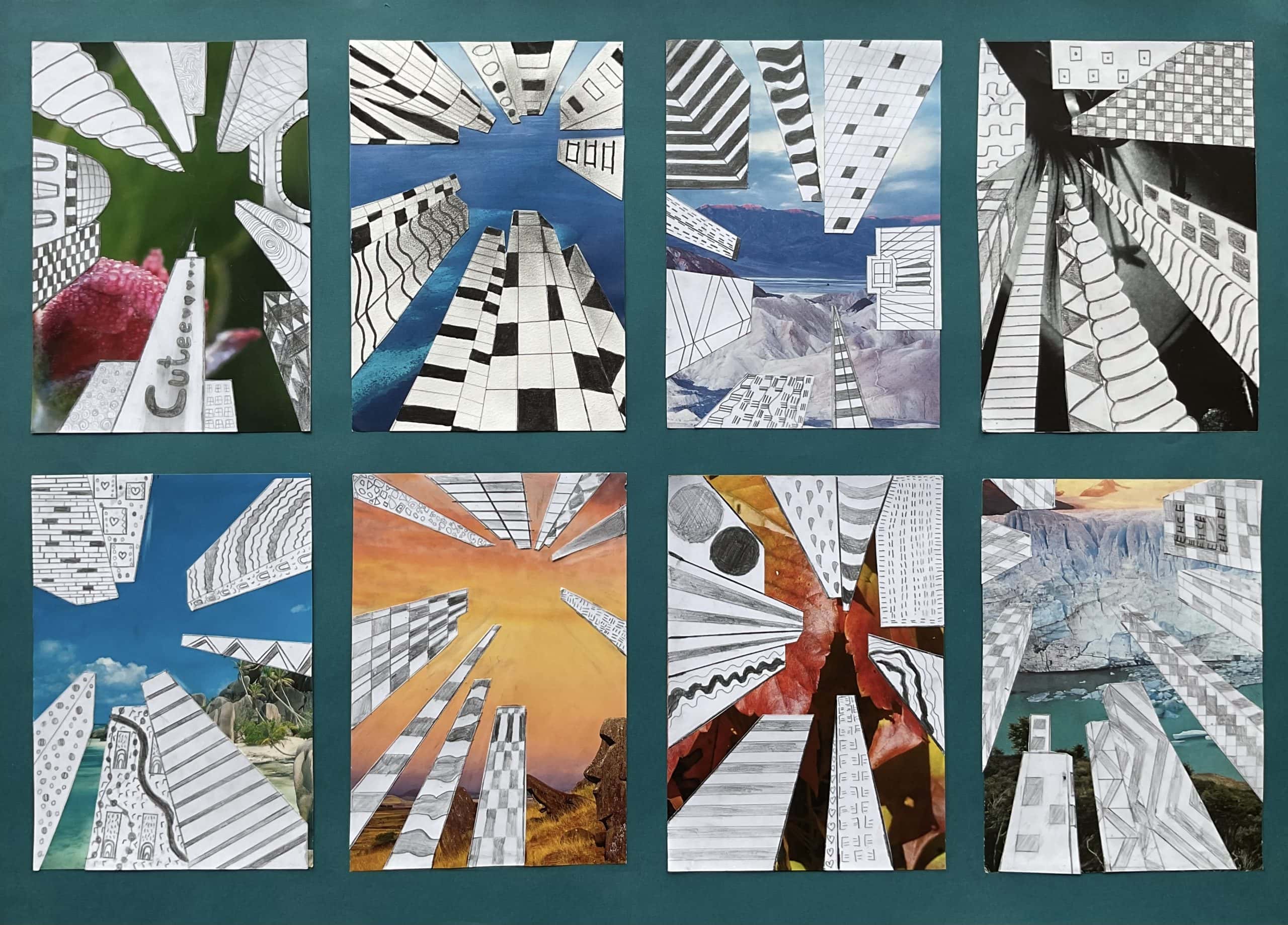 Die Schülerinnen und Schüler der Klassen 8c, 8d und 8g entwarfen im Kunstunterricht eigene hohe Gebäude und zeichneten sie mit Bleistift und teils Fineliner in der Zentralperspektive. Bei dieser handelt es sich um ein Konstruktionsverfahren zur Erzeugung von Tiefe und Raum, welches vom Standpunkt des Betrachters abhängig ist. Die Klassen berücksichtigten die Frosch- bzw. Vogelperspektive.