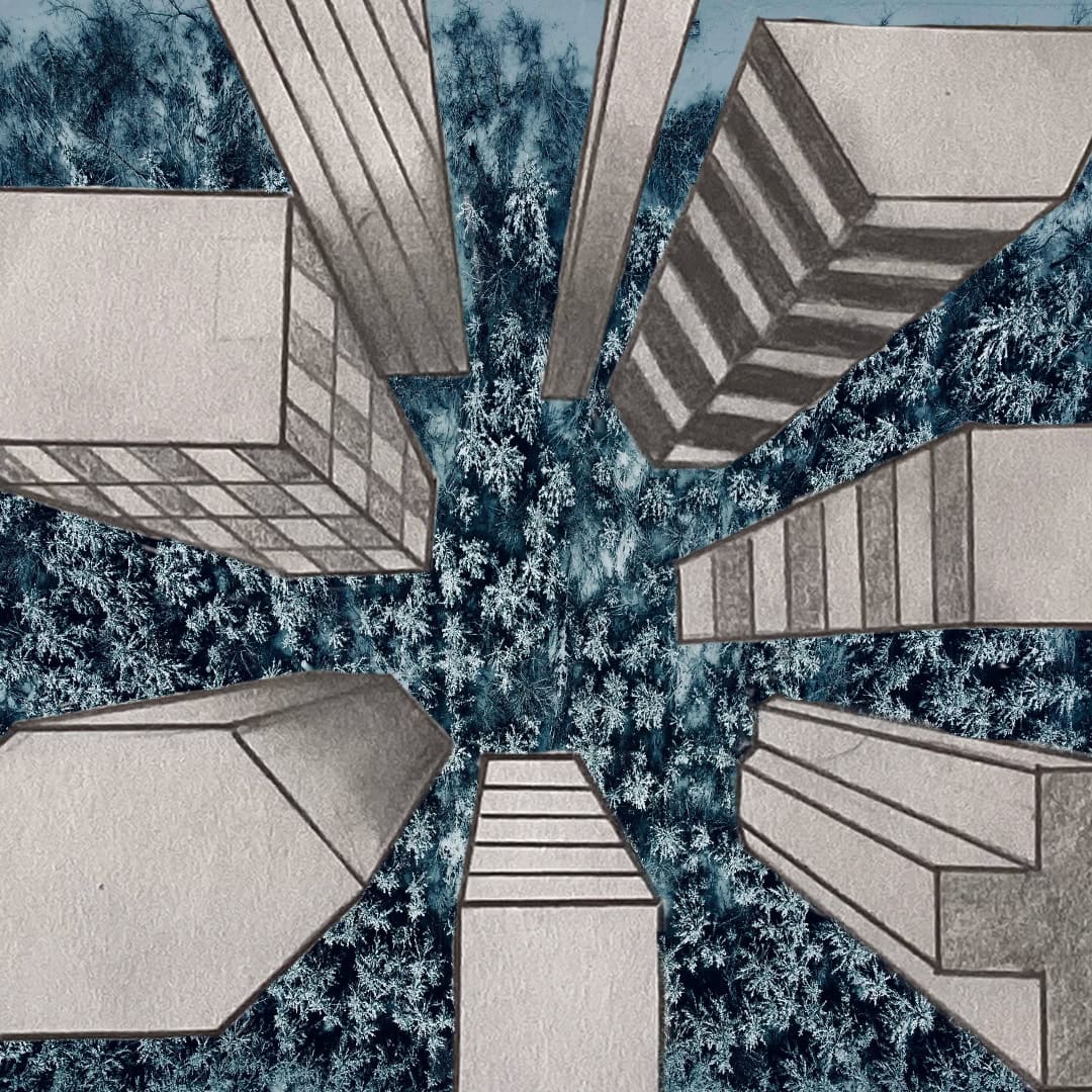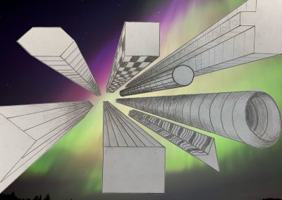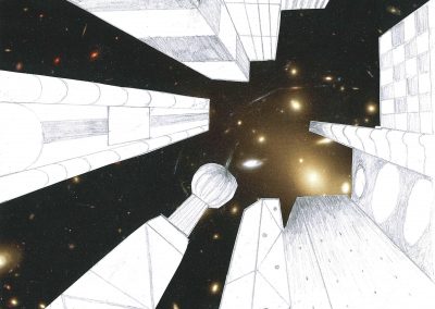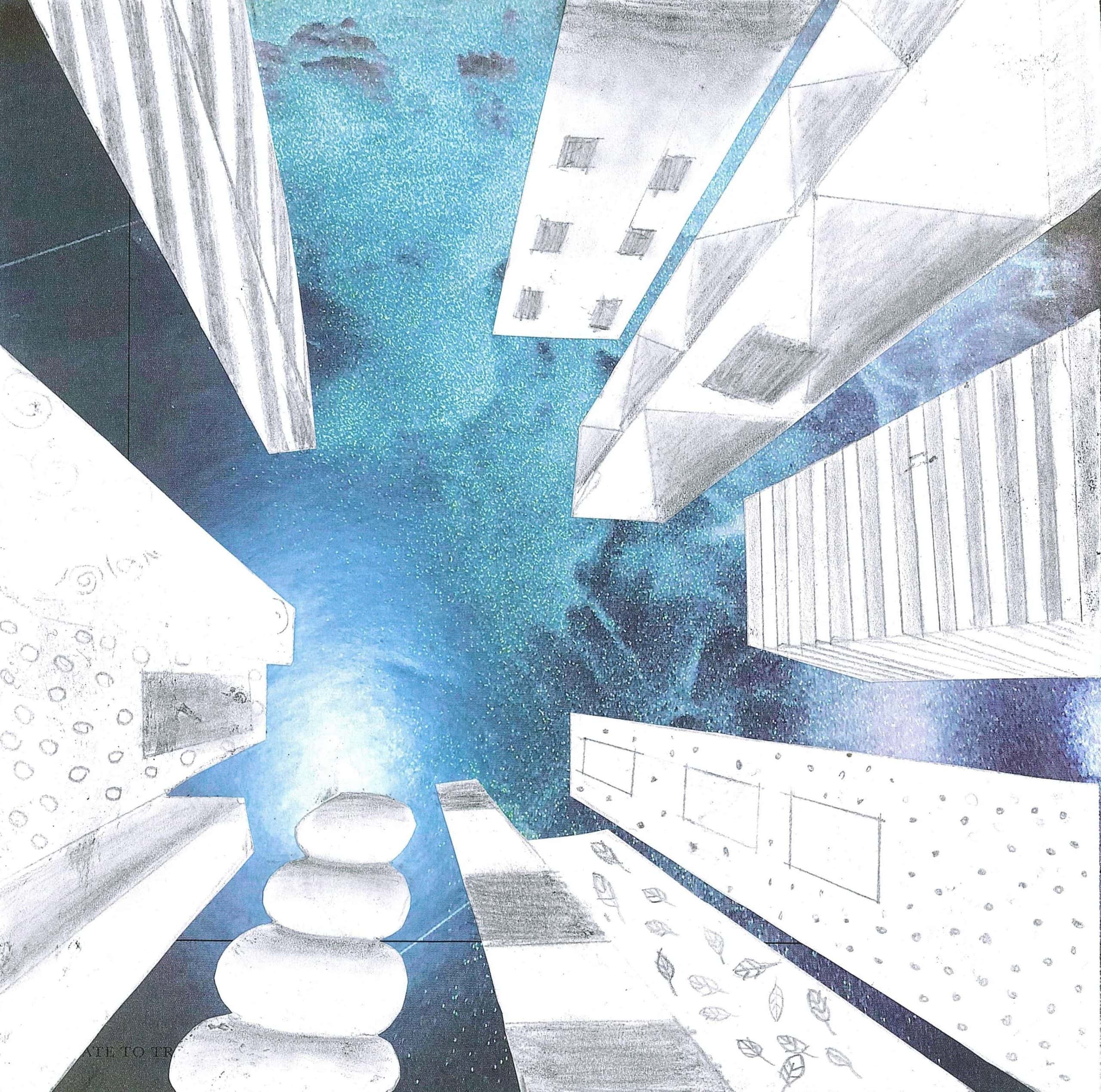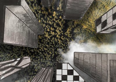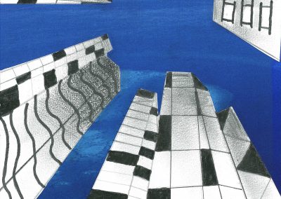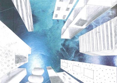 Die Schülerinnen und Schüler der Klassen 8c, 8d und 8g entwarfen im Kunstunterricht eigene hohe Gebäude und zeichneten sie mit Bleistift und teils Fineliner in der Zentralperspektive. Bei dieser handelt es sich um ein Konstruktionsverfahren zur Erzeugung von Tiefe und Raum, welches vom Standpunkt des Betrachters abhängig ist. Die Klassen berücksichtigten die Frosch- bzw. Vogelperspektive.