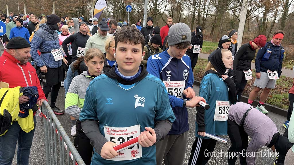 Bei bestem Laufwetter am 07. Dezember 2025 nahm die Grace-Hopper-Gesamtschule Teltow mit großem Engagement am Teltower Halbmarathon teil. Insgesamt gingen fünf Halbmarathon-Staffeln an den Start, bestehend aus Lehrkräften sowie Schülerinnen und Schülern unserer Schule. Jedes Staffelmitglied absolvierte dabei eine Strecke von 7 Kilometern.